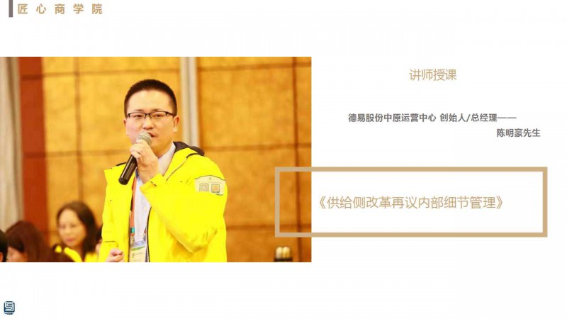 三、15:50-16:00 課間休息 《供給側改革再議內(nèi)部細節(jié)管理(二)》——德易股份遠程移動醫(yī)療中原運營中心 創(chuàng)始人/總經(jīng)理 陳明豪先生