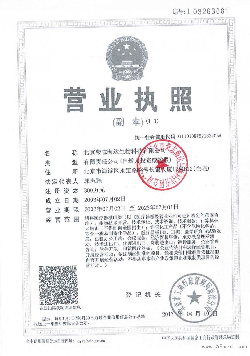 | 發(fā)證機(jī)構(gòu): | ??北京市工商行政管理局海淀分局 | 發(fā)證時(shí)間 : | ??2017-04-10 |
