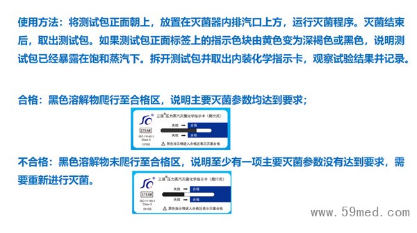 使用方法:將測(cè)試包正面朝上,放置在滅菌器內(nèi)排汽口上方,運(yùn)行滅菌程序。滅菌結(jié)束后,取出測(cè)試包。如果測(cè)試包正面標(biāo)簽上的指示色塊由黃色變?yōu)樯詈稚蚝谏?,說(shuō)明測(cè)試包已經(jīng)暴露在飽和蒸汽下。拆開(kāi)測(cè)試包并取出內(nèi)裝化學(xué)指示卡,觀察試驗(yàn)結(jié)果并記錄。